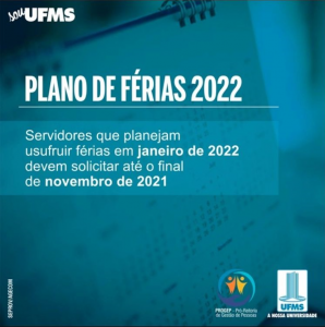 Informamos que encontra-se liberado o Plano de Férias referente ao exercício de 2022, no Sistema de Gestão de Férias – Sigef (https://sigef.ufms.br), que é o canal exclusivo para marcação de férias dos servidores da UFMS.