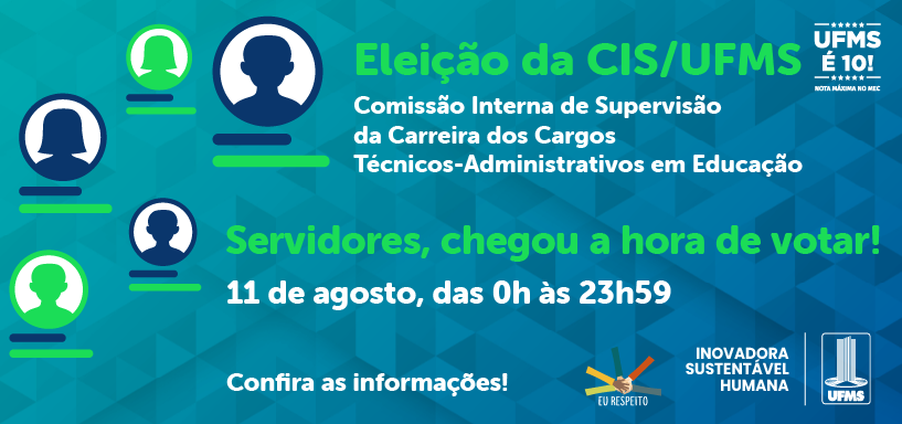 No dia 11 de agosto, das 0h00 às 23h59, haverá o processo de escolha dos membros da Comissão Interna de Supervisão da Carreira dos Cargos Técnico-Administrativos em Educação – CIS/UFMS.